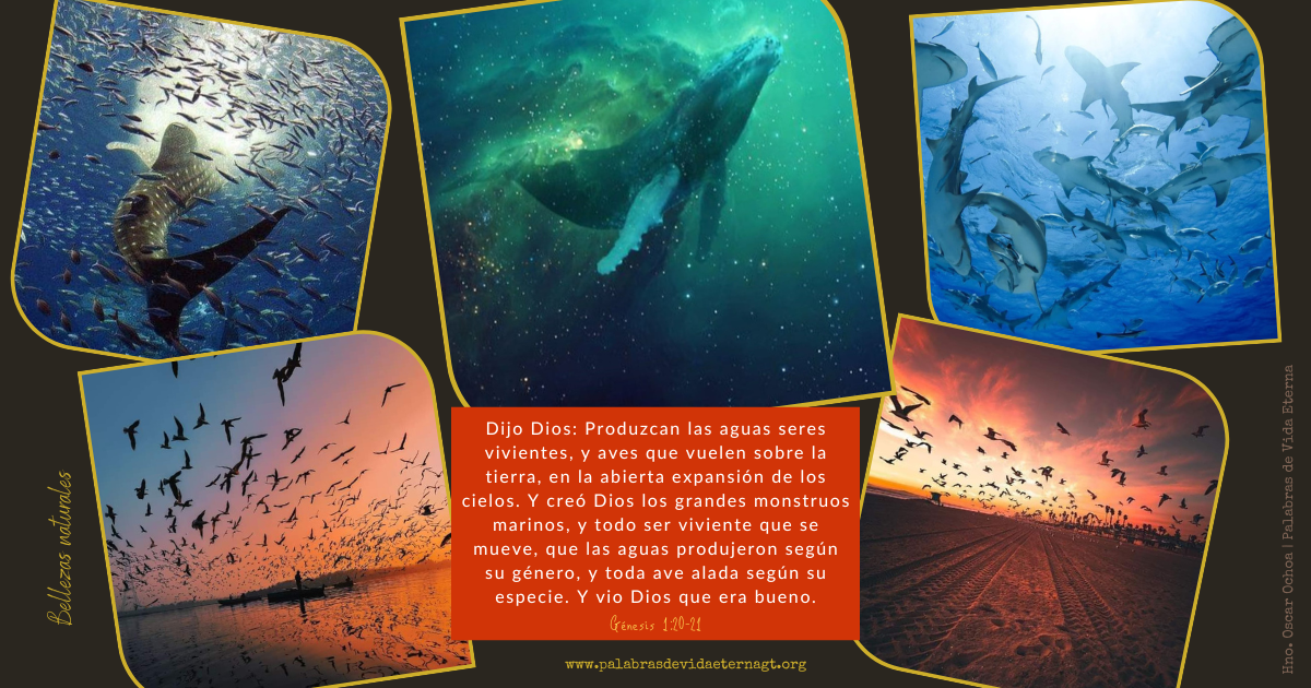 «Dijo Dios: Produzcan las aguas seres vivientes, y aves que vuelen sobre la tierra, en la abierta expansión de los cielos. Y creó Dios los grandes monstruos marinos, y todo ser viviente que se mueve, que las aguas produjeron según su género, y toda ave alada según su especie. Y vio Dios que era bueno.»