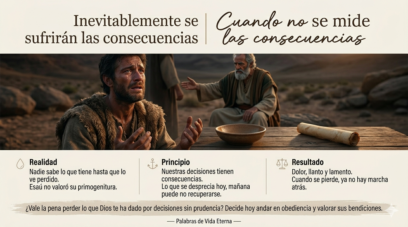 Esaú actuó impulsiva, necia y despectivamente hacia sus privilegios (Gn. 27:33-38) y aunque después se percató de su mala decisión, las consecuencias era inevitables. Su dolor y llanto eran consecuencias de sus propias decisiones (v. 38).